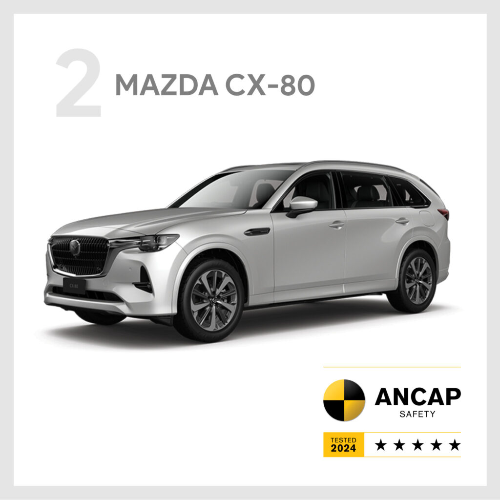 Mazda CX-80 ได้รับคะแนนการปกป้องผู้โดยสารที่เป็นผู้ใหญ่สูงสุดเป็นอันดับสองในปี 2024 ที่ 92% โดยได้รับคะแนนเต็มในการทดสอบการชนด้านข้าง การชนด้านข้างระยะไกล การป้องกันการเหวี่ยงคอ และการชนเสาเฉียง”