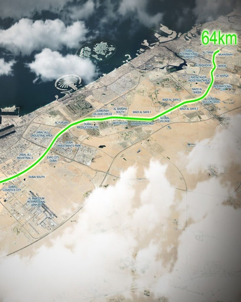 ทางหลวงแห่งอนาคตยกระดับมาตรฐานด้านสิ่งแวดล้อมและสังคม ระยะทาง 64 กิโลเมตร และรองรับการขยายตัวของจำนวนประชากรในดูไบแห่งนวัตกรรมและความยั่งยืน การบูรณาการพื้นที่สีเขียวชอุ่ม รถรางพลังงานแสงอาทิตย์ที่ล้ําสมัย และเทคโนโลยีอัจฉริยะขั้นสูง Dubai Green Spine ช่วยจินตนาการถึงการเคลื่อนไหวและการเชื่อมต่อในเมือง