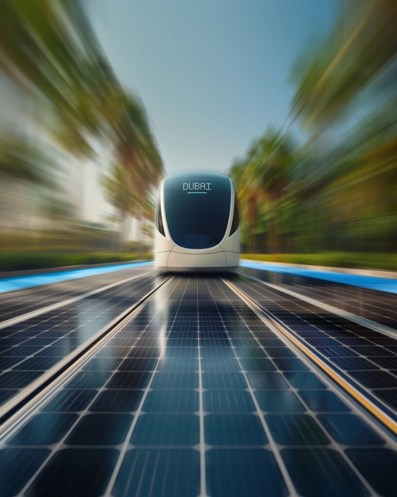 หัวใจของ Dubai Green Spine คือรถรางที่ใช้พลังงานแสงอาทิตย์ 100% ซึ่งได้รับการสนับสนุนโดยระบบพลังงานแสงอาทิตย์ขนาด 300 เมกะวัตต์ โครงการริเริ่มด้านพลังงานสะอาดที่สำคัญนี้มีส่วนสำคัญในการลดการปล่อยก๊าซคาร์บอนไดออกไซด์ของเมืองและส่งเสริมการเปลี่ยนจากการพึ่งพารถยนต์ไปสู่รูปแบบการขนส่งที่ยั่งยืนมากขึ้น