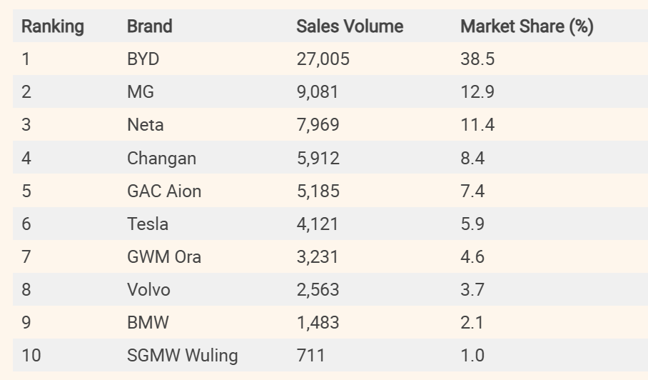 ในประเทศไทย ยอดจดทะเบียนรถยนต์ไฟฟ้าล้วนในปี 2024 อยู่ที่ 70,137 คัน ลดลง 8.1% จากปีก่อน ในบรรดาแบรนด์รถยนต์ที่ขายดีที่สุด 10 อันดับแรก มี 7 แบรนด์แรกเป็นแบรนด์จีน โดย BYD ครองอันดับ 1 ในด้านยอดขายตลอดทั้งปี โดยมีส่วนแบ่งการตลาดมากกว่าหนึ่งในสาม
