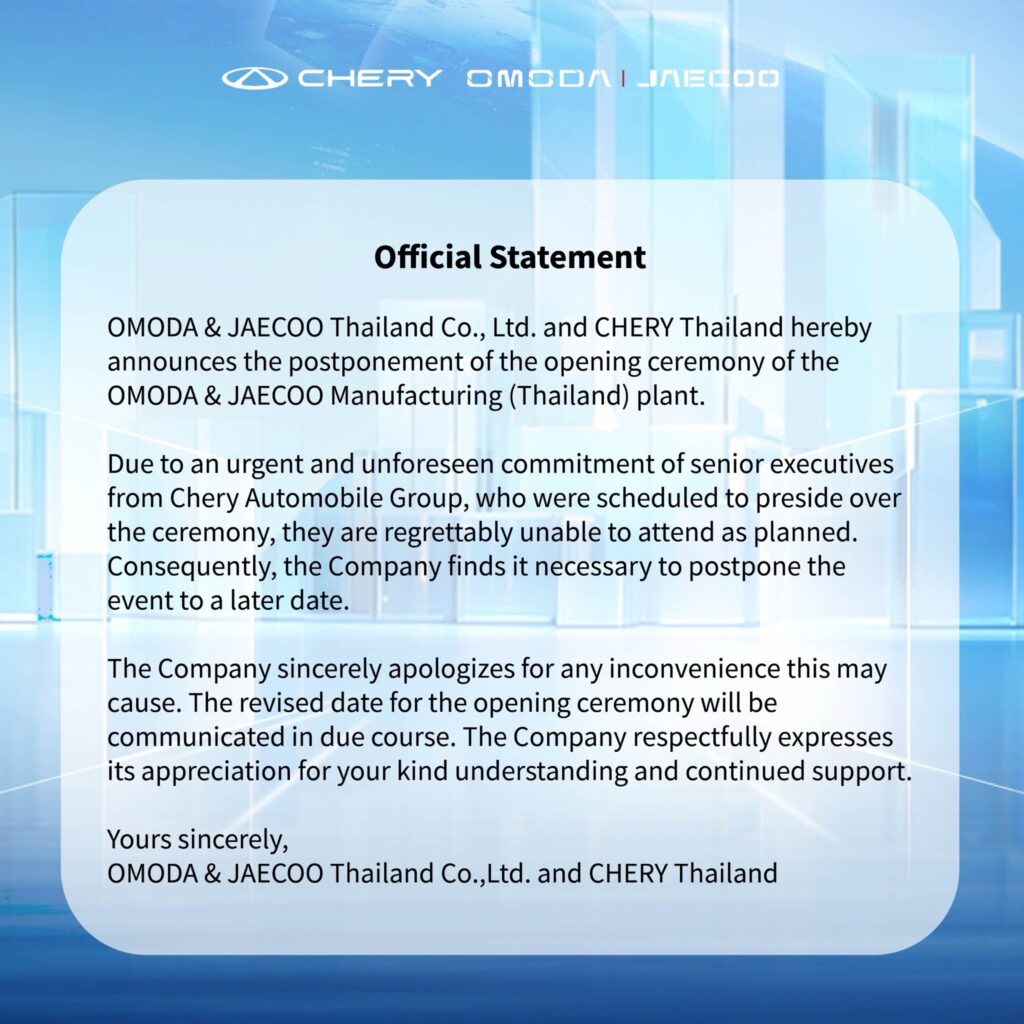 เหตุการณ์ที่ CHERY Group แบรนด์ OMODA & JAECOO ประกาศยกเลิกพิธีเปิดโรงงานประกอบรถยนต์มูลค่ากว่า 5,000 ล้านบาทที่จังหวัดระยองแบบฟ้าผ่า เมื่อคืนวันที่ 25 กุมภาพันธ์ 2026 ก่อนงานเริ่มเพียงไม่กี่ชั่วโมง ถือเป็นประเด็นร้อนที่สั่นคลอนความเชื่อมั่นของแบรนด์อย่างรุนแรงในวงการยานยนต์ไทย