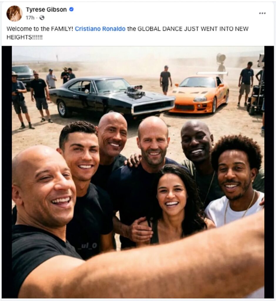 และไม่นาน Tyrese Gibson ซึ่งเป็นส่วนหนึ่งของ ทีม Fast & Furious มาตั้งแต่ภาค 2 โพสต์ภาพบนเฟซบุ๊กร่วมกับโรนัลโดต้อนรับ “เข้าสู่ครอบครัว”