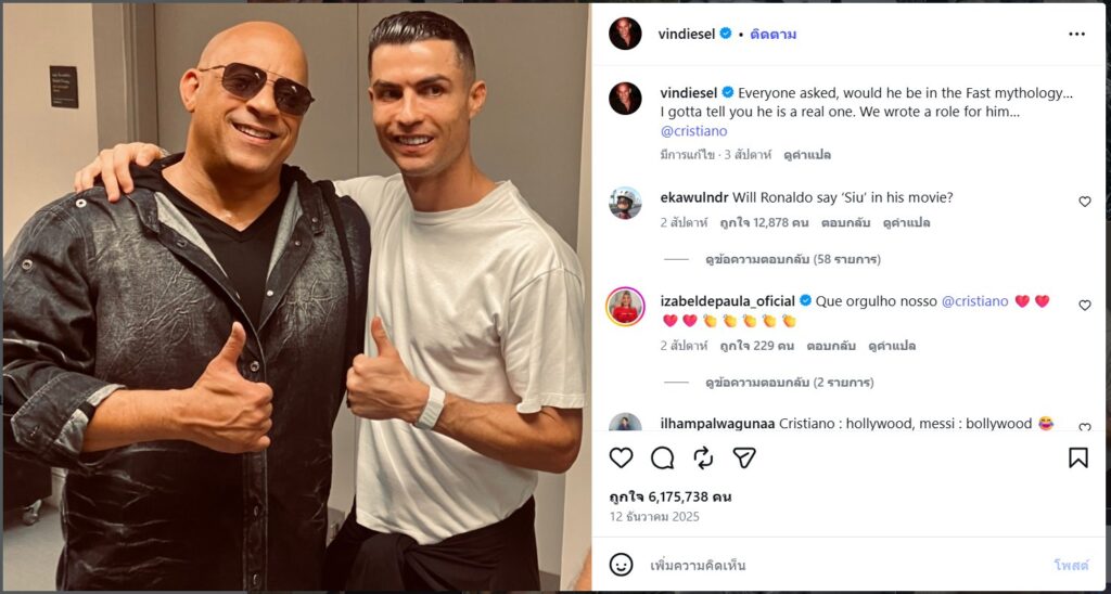 บัญชี IG อย่างเป็นทางการของ Vin Diesel’s ได้โพสต์ภาพของตัวเองและโรนัลโด พร้อมคำบรรยายว่า “ทุกคนถามว่าเขาจะอยู่ในตำนาน Fast หรือไม่… ผมต้องบอกคุณว่าเขาเป็นตัวจริง เราเขียนบทสำหรับเขาไว้แล้ว… @cristiano”